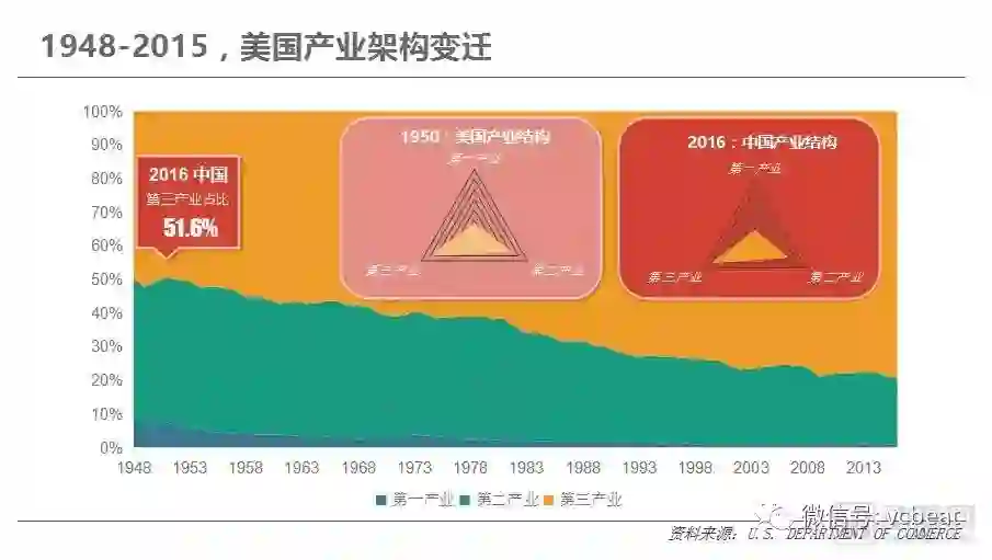 目前,我国产业结构大抵与美国上世界五十年代相当。在上世界五十年代,战后的经济复苏,催生了美国消费、服务需求的释放。