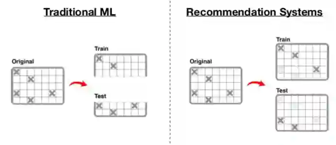 在传统的机器学习中,我们通过分割原始数据集来创建一个训练集和一个验证集。然而,这对于推荐系统模型不起作用,因为如果我们在一个用户群上训练所有数据然后在另一个用户群上验证它,模型不会起作用。