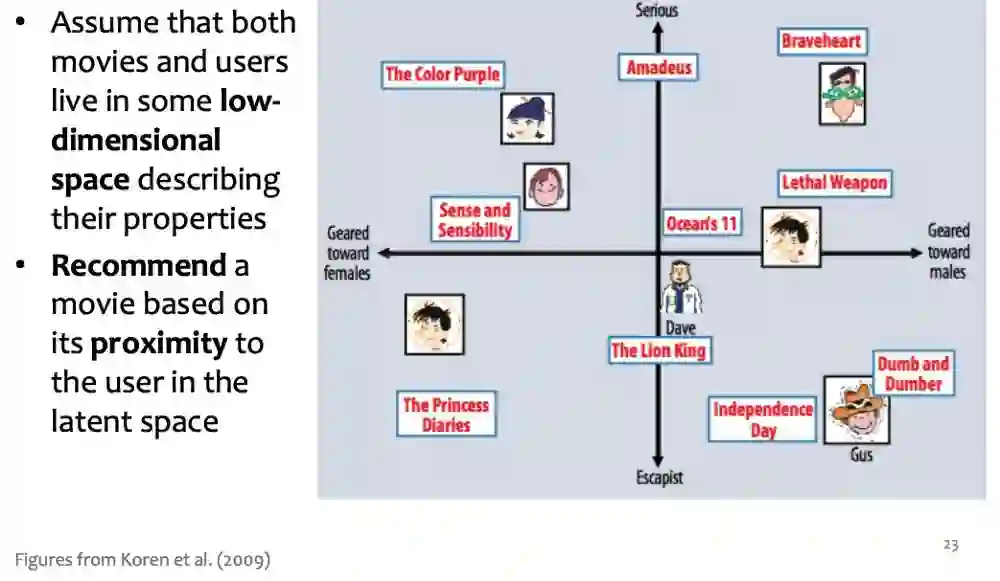 用户评分是由人生成的电影特征。我们认为这些可以直接观察到的特征很重要。然而,也有一些不可直接观察到的特定特征,它们在评分预测中也很重要。这些隐性特征被称为潜在特征(Latent Features)。