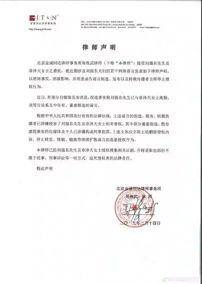 北京金诚同达律师事务所周俊武律师发布《关于近期涉及刘强东夫妇若干网络谣言的律师声明》称,“近日,有部分自媒体发布消息,捏造事实称刘强东先生已与章泽天女士离婚,该言论系无中生有、蓄意捏造的谣言,将采取包括但不限于民事、刑事诉讼等一切方式,追究侵权者的法律责任。”