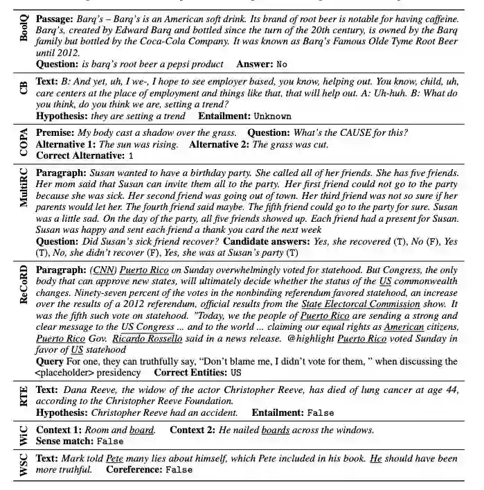 此外,SuperGLUE还包含基于已有数据的抽取、单个数值的表现指标,以及一套分析工具包jiant。