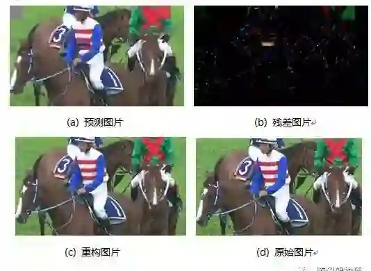 图6(a) 就是根据最终的块划分方式和预测模式得到的预测图片。预测图片和原始图片的差值(残差)通过DCT变换,量化之后,最终通过熵编码器输出。图片预测的残差如图6(b)所示。在解码器中,根据得到的残差数据,并进行和编码器相同的预测,可以得到最终的重构图片,图6(c)所示的就是重构数据。由于编码过程需要用到重构数据作为参考数据,因此在编码器也需要进行重构的过程。原始图片如图6(d)所示,可以看出,重构的图片和原始图片损失非常小。