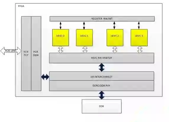 FPGA的逻辑架构主要包括平台部分和HEVC编码器IP部分,其中FPGA平台主要包括PCIE DMA以及DDR总线相关逻辑,这部分逻辑主要实现和host CPU的数据通信以及和FPGA板卡上的DDR通信。如图7所示,FPGA架构上实例化了4个HEVC core(具体几个是和FPGA资源有关),每一个HEVC core完成HEVC编码算法的完整处理,这里4核心并行工作,也就是同一时刻,4个编码任务可以并行工作,同时输出4条HEVC码流。