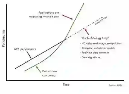 一方面处理器性能再无法按照摩尔定律进行增长,另一方面数据增长对计算性能要求超过了按“摩尔定律”增长的速度。处理器本身无法满足高性能计算(HPC:High Performance Compute)应用软件的性能需求,导致需求和性能之间出现了缺口(参见图2)。