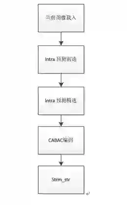 FPGA HEVC core内部算法处理流程如图8所示:分为当前图像载入,intra预测初选,intra预测精选,CABAC编码,码流输出。