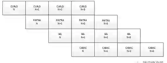 那么如何设计HEVC core实现算法功能呢?这里,编码器模块流水线设计成四级流水,如图9所示,四级流水CURLD/PINTRA/SEL/CABAC处理性能设计接近,并行起来后,平均处理每个LCU需要8400个周期,如果按照1080p图片一共510个LCU计算,单核理论上编码可以达到编46 帧/s (FPGA电路实现频率200M),这样4核并行能达到184帧/s。
