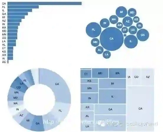 理解其他形式的图的表现优势, 比如, 气泡图支持更多地数据范围, 饼图支持局部全局的对比, 树状图能够支持分层结构等等。