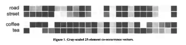例如,上图可视化了“路”(road)、“街”(street)以及“咖啡”(coffee)、“茶”(tea)这两对词向量。每个词向量有25个维度(25个上下文中出现的单词),灰度表示同时出现的频率。从图中很明显能看到“路”、“街”的相似性以及“咖啡”、“茶”的相似性。另外,我们也看到,“街”和“咖啡”并不相似。(图片来源于Lund等1996年发表的论文,因年代较早,印刷、扫描的质量不高,图片有点模糊,见谅。)