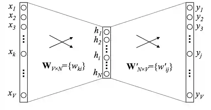 经过训练之后,我们使用输入层和隐藏层之间的连接权重矩阵WVxN表示单词之间的关系。矩阵W共有V行,每一行都是一个N维向量,每个N维向量分别对应一个单词。这样,词向量的维度就从V降到了N。