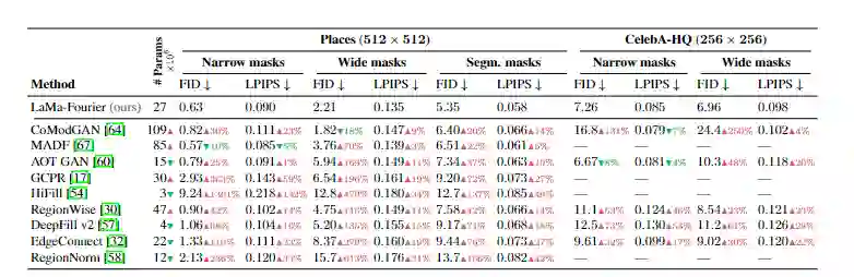 研究人员在CelebA-HQ数据集上的图像修复进行了实验,采用可学习感知图像斑块相似性(LPIP)和FID作为定量评估指标。与LaMa傅立叶模型相比,几乎所有的模型的性能都更弱(红色上箭头)。表中还包括了不同的测试掩码生成的不同策略的度量,即窄掩码(narrow)、宽掩码(wide)和分段掩码(segmentation),LaMa傅里叶的性能仍然更强,表明了实验方法更有效地利用了可训练参数。