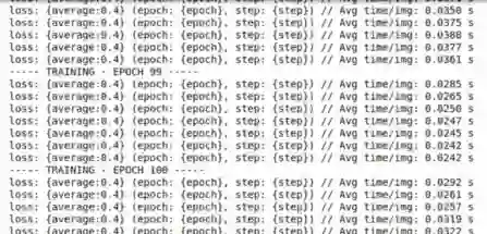 print(‘loss: {average:0.4} (epoch: {epoch}, step: {step})’, “// Avg time/img: %.4f s” % (sum(time_train) / len(time_train) / BATCH_SIZE))