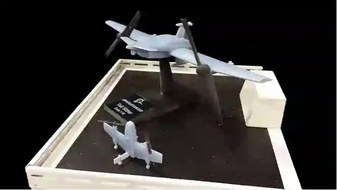 ●波音公司可能用图中模型所示的为做事垂直起降方案竞标MUX项目。图中前方为波音公司此前制造过的小尺寸验证机模型(美国《航空周刊与空间技术》图片)