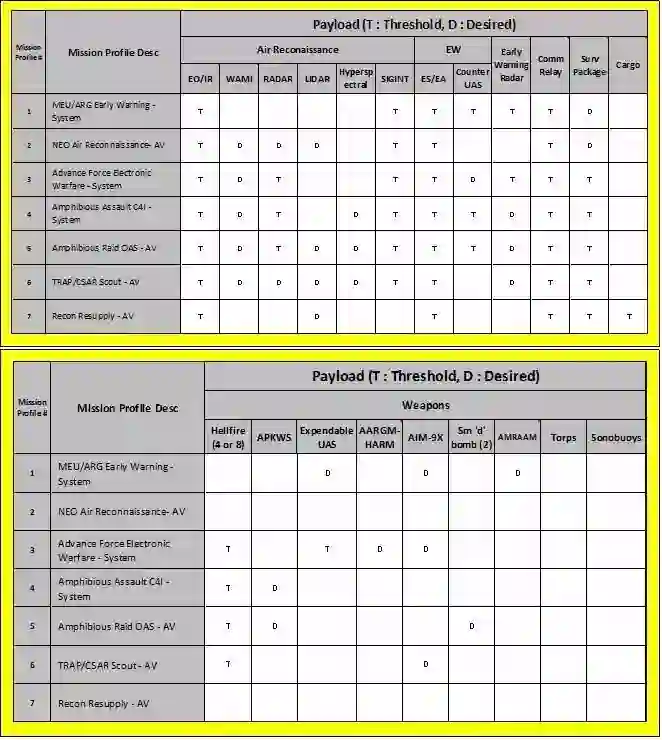 其他要求:能在水陆两栖舰船上长期部署使用,能进行空中加油,能在恶劣环境下全天候/全时域使用等。此外,海军陆战队还提出了MUX的7个典型任务剖面要求,包括空中预警、空中侦察、电子战、两栖突袭时C4I,两栖突击作战及支援,侦察部队再补给等。