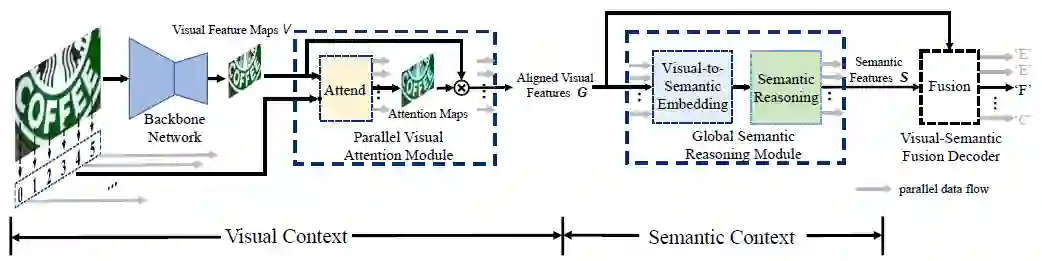 论文围绕自然场景文本识别,针对语义信息利用受限、解码效率低等问题,提出了语义推理模块Global Semantic Resoning Module (GSRM)用于实现全局语义信息推理,并在此基础上,提出了端到端的语义推理网络Semantic Reasoning Networks (SRN),可以融合视觉特征与语义特征。
