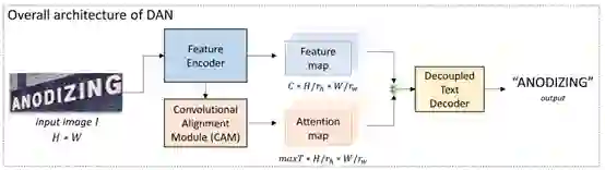 DAN由3个模块组成:特征提取器(FE)、卷积对齐模块(CAM)、去耦解码器(DTD),如下图所示。FE对输入图片提取多个尺度的特征图;CAM接收特征提取器中的多尺度特征,采用全卷积结构,输出与特征图等尺寸的attention map;最后DTD解码出识别结果。