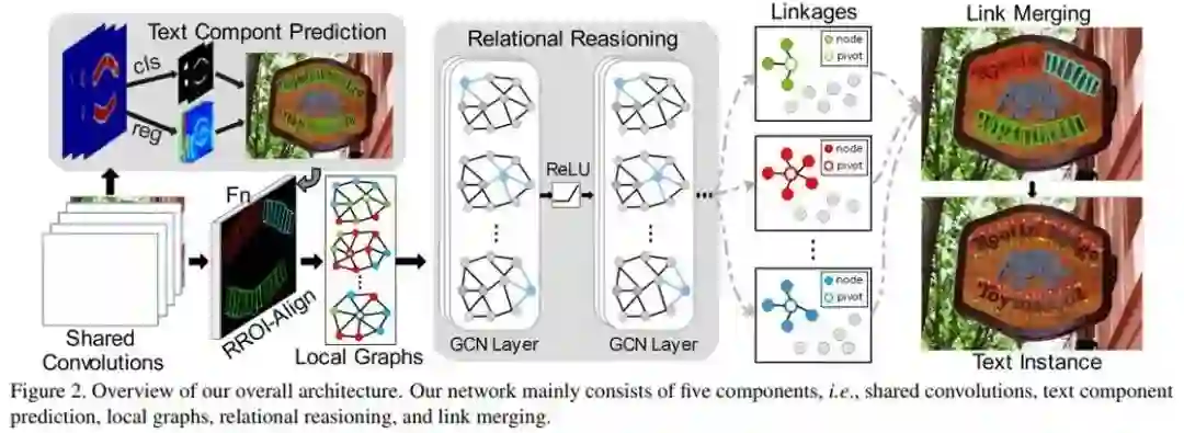 该方法将每个文本实例表示成许多个矩形的文本组件,然后把每个文本组件视为一个节点,通过该论文提出的局部子图(Local Graph)将同一张图中的文本组件节点划分成多个子图,每个子图包含一个中心节点和其二阶以内的邻居节点,最后通过一个图卷积神经网络模型进行学习和推理中心节点与其邻居节点的关系。同时,在局部子图的桥接下,文本组件预测模型(CNN)和关系推理模型(GCN)组合成了一个端到端可训练的任意形状文本检测系统。
