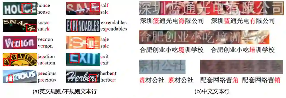 Figure 1. SRN的识别结果,证实了语义模块GSRM的有效性。在(a)中图像右侧顶部文本行是纯视觉的识别结果,图像右侧底部文本行是SRN识别结果。在(b)中图像下方靠左的文本行是纯视觉的识别结果,图像下方靠右的文本行是SRN识别结果。