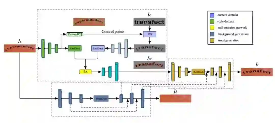 1.Text Swapping Network:提取待替换图像的前景文字的几何形状和风格特征,并将其转换到输入文本图像上;