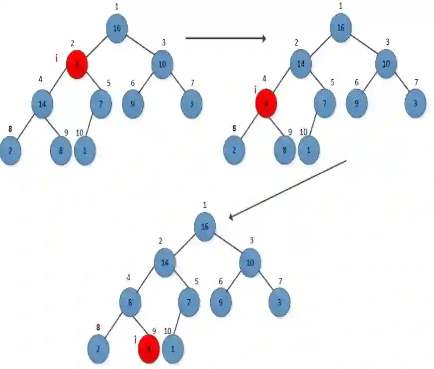 这个过程的意思其实很简单,就是如果所建的堆不满足堆的性质的时候,如何来调整的过程。下图是书中的栗子,当i=2的时候,就是第二个元素,4小于其叶子结点14,应该调整为他右边的样子,交换4和14的位置,然后交换以后发现4和8又不满足堆的性质了,所以递归上面这个过程,这时候i=4。得到下面那个图,此时不再有数据交换发生。时间负责度为O(h),h为树的高度。