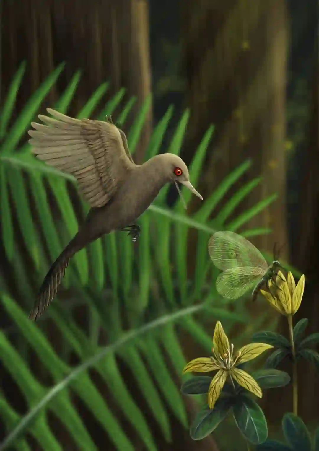距今约一亿年前,眼齿鸟生活在缅甸北部潮湿的热带环境中,不幸被柏类或南洋杉类等针叶树流下的树脂包裹,在漫长的地质年代中形成琥珀,并保存至今。