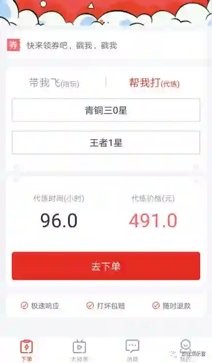 “带我飞”意味着陪玩,由打手带玩家一同进行游戏,小官选择带飞段位从青铜三0星到王者1星,APP下方出现可选1带1、2带1、4带1模式,价格分别为1513元、2269.5元、3026元。“帮我打”则是普通意义上的“代练”,同样从青铜三0星到王者1星,代练市场预估96小时,价格显示为491元。