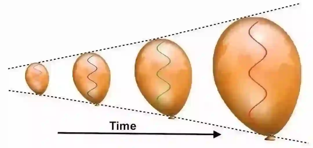 宇宙经历了一次指数式的暴胀(Inflation)。(图片来源:http://daisy.astro.umass.edu/~myun/teaching/a100_old/longlecture25.html)