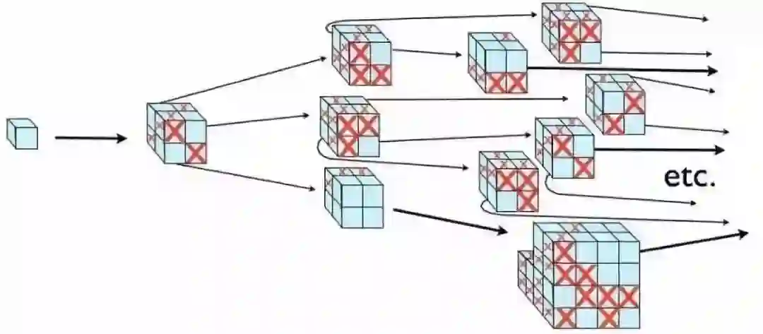 在永恒暴胀理论中,暴胀永远不会停止。图中红色X的记号代表暴胀停止的区域,比如我们的宇宙。绿色则代表暴胀继续的区域,会一直无限持续下去。(图片来源:E.Siegel)
