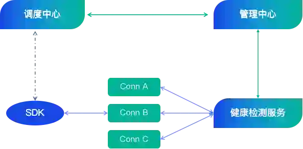 首先 SDK 向极光调度中心发起请求,调度中心充分考虑运营商网络、SDK 的地域和接入网关本身的负载因素,分配一个接入网关的 IP 地址,SDK 获得返回接入网关地址后,向对应的接入网关发起请求建立长链接。此外极光配有健康检测服务模块,定时检测各个接入网关状态并上报到管理中心,管理中心会根据网关的状态来决定该网关是否是可以被调度。如果受到攻击等因素导致接入网关大范围不可用的情况下,接入网关还可以借助于云主机来实现自动扩容接入网关,以满足日常大量的 SDK 接入需求。
