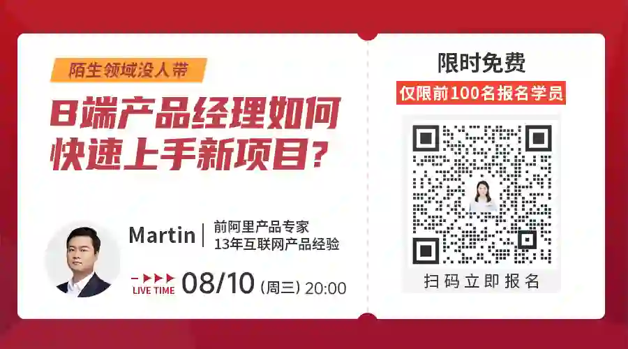 8月10日(周三晚20点),前阿里产品专家@Martin在线直播 ,结合3个具体案例为你拆解#接手B端新产品,如何快速上手#