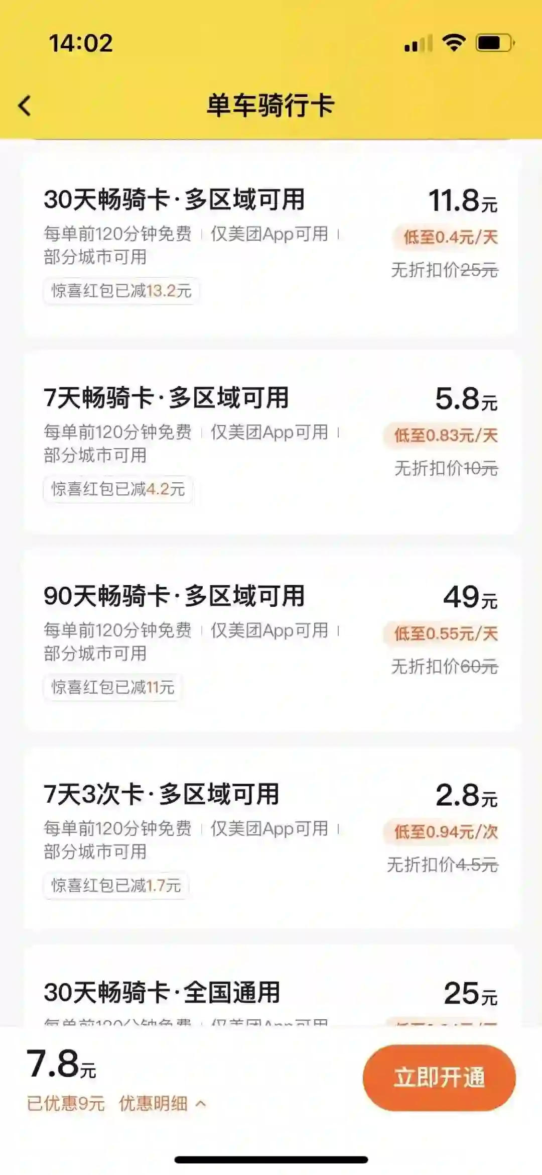 不过美团单车经常会有优惠活动,除全国通用卡外,其他可能会有6折左右优惠。