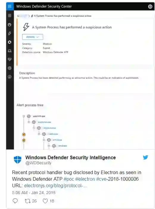 这个漏洞位于Electron框架的app.setAsDefaultProtocolClient API中,周一已打上了补丁:Electron团队发布了这个软件构建框架的1.8.2-beta.4、1.7.11和1.6.16版本。