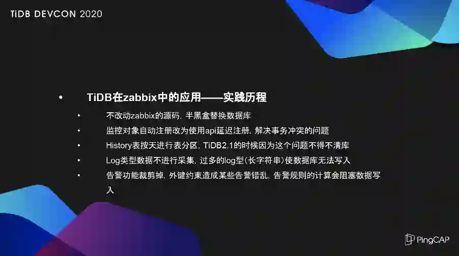 我们通过以上的探索来解决了一些问题,完成了 TiDB 在 Zabbix 中的有效应用。
