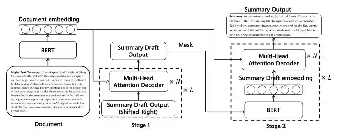 如模型图中所示,首先依次将摘要草稿中的每个单词掩盖住,而后将掩盖后的序列输入 BERT 并得到序列的上下文表示。而后这个上下文表示被输入 N 层 Transformer 的解码器并与源文档表示进行交互预测摘要的每个单词。