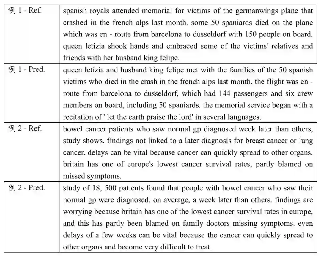 下面是两个模型预测(Pred.)和正确摘要(Ref.)的例子。