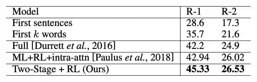 为了验证模型的效果,作者在 CNN/DailyMail 和 NYT-50 两个摘要数据集上进行了实验,并与当前一些主要方法进行了对比。其中 NYT-50 数据集是 NYT 数据集中删选所有摘要长度大于 50 的样本得到。在 CNN/DailyMail 数据集上作者进行了消融实验,以此来验证每个模块的作用。