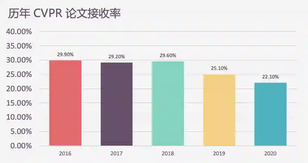 从论文接收率来看,被接收难度似乎在逐年增大,从 2018 年的 29.6% 到 2019 年的 25% 再到 2020 年的 22%,两年都出现了下降趋势。