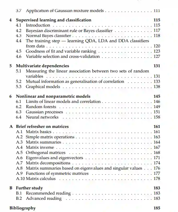 科学用实验来验证关于世界的假设。统计学提供了量化这一过程的工具,并提供了将数据(实验)与概率模型(假设)联系起来的方法。因为世界是复杂的,我们需要复杂的模型和复杂的数据,因此需要多元统计和机器学习。具体来说,多元统计(与单变量统计相反)涉及随机向量和随机矩阵的方法和模型,而不仅仅是随机单变量(标量)变量。因此,在多元统计中,我们经常使用矩阵表示法。与多元统计(传统统计学的一个分支)密切相关的是机器学习(ML),它传统上是计算机科学的一个分支。过去机器学习主要集中在算法上,而不是概率建模,但现在大多数机器学习方法都完全基于统计多元方法,因此这两个领域正在收敛。多变量模型提供了一种方法来学习随机变量组成部分之间的依赖关系和相互作用,这反过来使我们能够得出有关兴趣的潜在机制的结论(如生物或医学)。