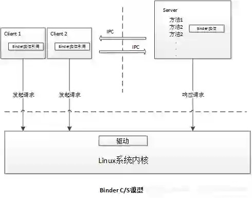 Binder是基于OpenBinder实现的,OpenBinder由Google公司的Dianne Hackborn开发,旨在提供一个简单的进程间互相通讯的途径。Binder机制采用C/S通信模型,它使用Binder来作为Server服务对外的访问接入点和Client向Server发起服务请求的"地址",并且在进程间通信的过程中,数据传输只需拷贝一次,并且Client的身份验证标志(UID/PID)只能由Binder机制在内核中添加,因此具有安全性高、传输性能好等优势。与其他IPC机制不同,Binder使用了面向对象的思想来描述Server端的访问接入点和Client端的服务请求发起地址,具体来说就是Server端的访问接入点实质是位于Server进程中的一个Binder实体对象,该对象提供了一套方法用于向Client端提供各种服务;Client端的“地址”即为Binder实体对象的引用,Client将持有该引用向Server端发起服务请求。下图为Binder机制的C/S模型:
