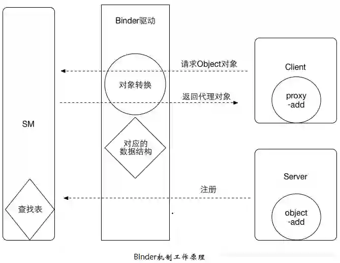Client进程要想访问Server进程的Binder实体的add方法,会将要访问Binder实体的名字以数据包的形式发送给Binder驱动,Binder驱动取出名字查询ServerManager中的查询表即可获得Binder实体及其引用。但是Binder驱动并没有将真正的Binder实体返回给Client,而是“照着”Binder实体的样子仿造一个一模一样的对象作为代理返回给Client,这个对象又被称之为代理对象ProxyBinder,它持有Binder实体的引用,且拥有与Binder实体完全相同能力(即方法),只是这些能力只是个“空壳”,真正的具体实现还是在Server进程的Binder实体中。由于驱动返回的代理对象(ProxyBinder)与Server进程中的Binder实体如此相似,给人的感觉好像是直接把Server进程Binder实体(对象)传递到了Client进程,因此,我们可以说Binder对象是可以跨进程传递的对象,而实际上Binder对象并没有传递,传递的仅仅是Binder对象的引用,它将通过代理对象来承载。也就是说,Server进程中Binder对象指Binder实体(也称Binder本地对象),Client进程中Binder对象指的是Binder代理对象。在Binder对象进行跨进程传递的时候,Binder驱动会自动完成这两种类型的转换。