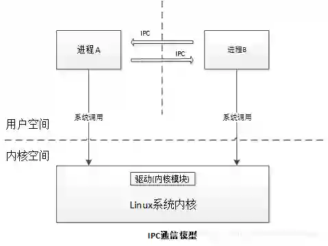 跨进程通信(IPC,Interprocess Communication)是一组编程接口,它允许在一个操作系统中不同进程之间传递或交换信息,其存储-转发方式通信过程大致为:假设有两个运行在用户空间的进程A、B,进程A要给进程B发送数据,那么进程A会通过系统调用copy_from_user将数据copy到内核空间,然后把内核空间通过系统调用copy_to_user将对应的数据copy到进程B即完成。下图为IPC通信模型: