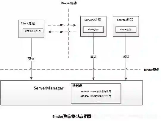 然后,Binder驱动将Binder的名字和新建的引用打包传递给ServerManager,ServerManager收到数据包后从中取出名字和引用填入一张查找表中,这张表就像一个“通讯录”且是系统唯一的,它记录了系统中各种Server的名字(Binder实体字符形式名字)和地址(Binder实体的引用),而被注册的这个Binder实体也称为实名Binder。