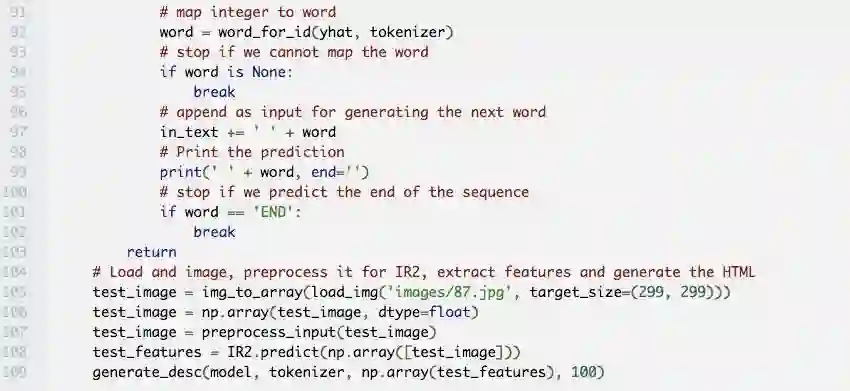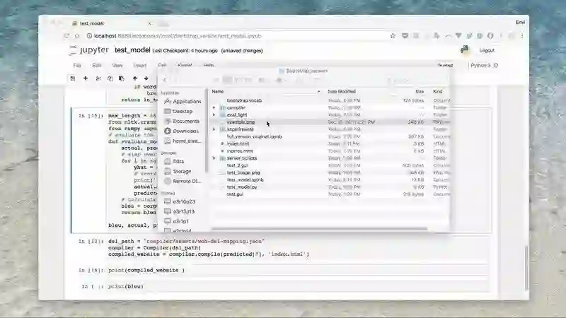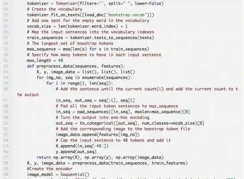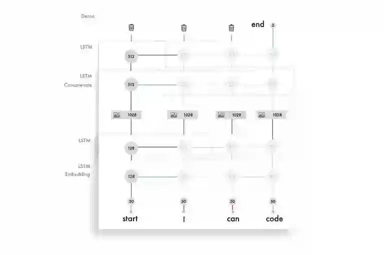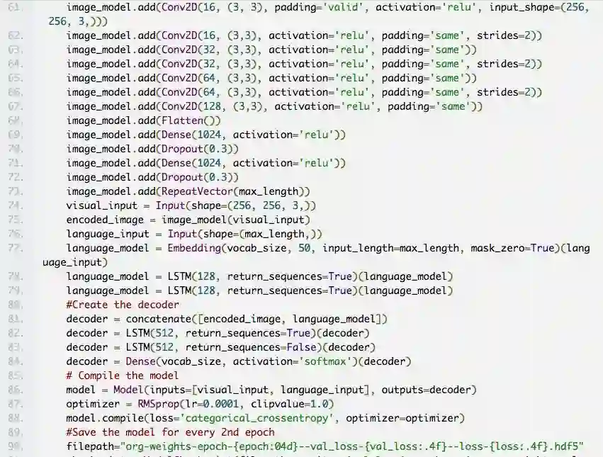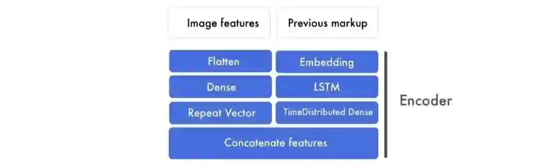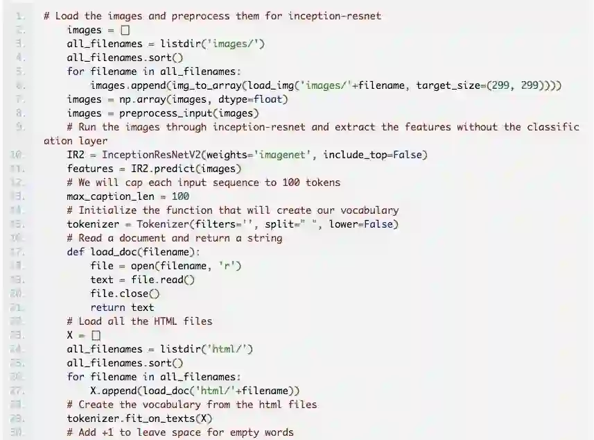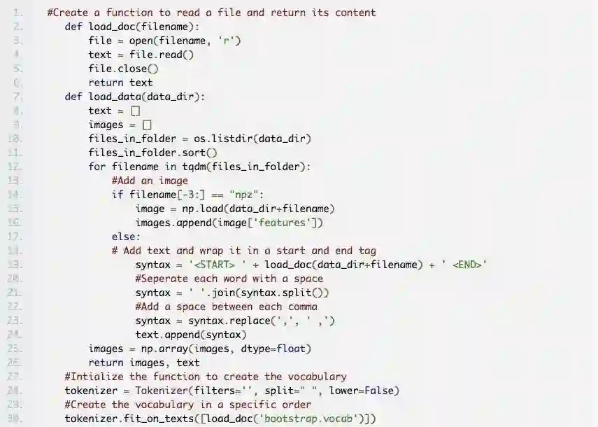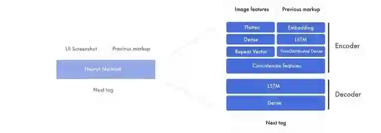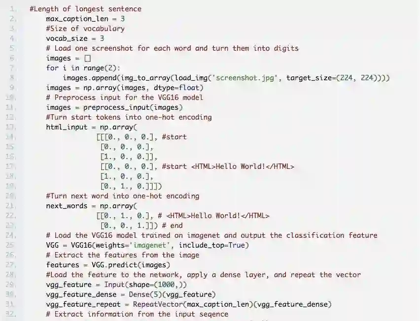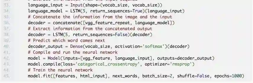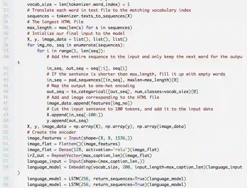这些模型是基于 Beltramelli 的 pix2code 论文和 Jason Brownlee 的图像自然语言描述教程而构建的,代码使用 Python 和 Keras(一个基于 Tensorflow 的框架)编写。