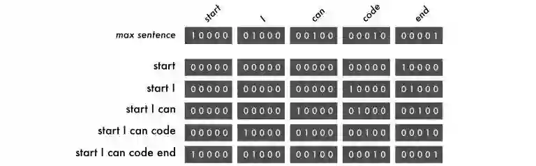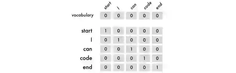 为了让神经网络理解这些标记,我使用了独热编码(one hot encoding)。因此“I can code”这一句就可以映射成: