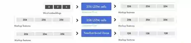 神经网络从数据中创建出不同的特征,用于连接输入和输出数据,创建模型,以便理解每张截图中所包含的内容和 HTML 语法,这就得到了预测下一个标签所需要的知识。