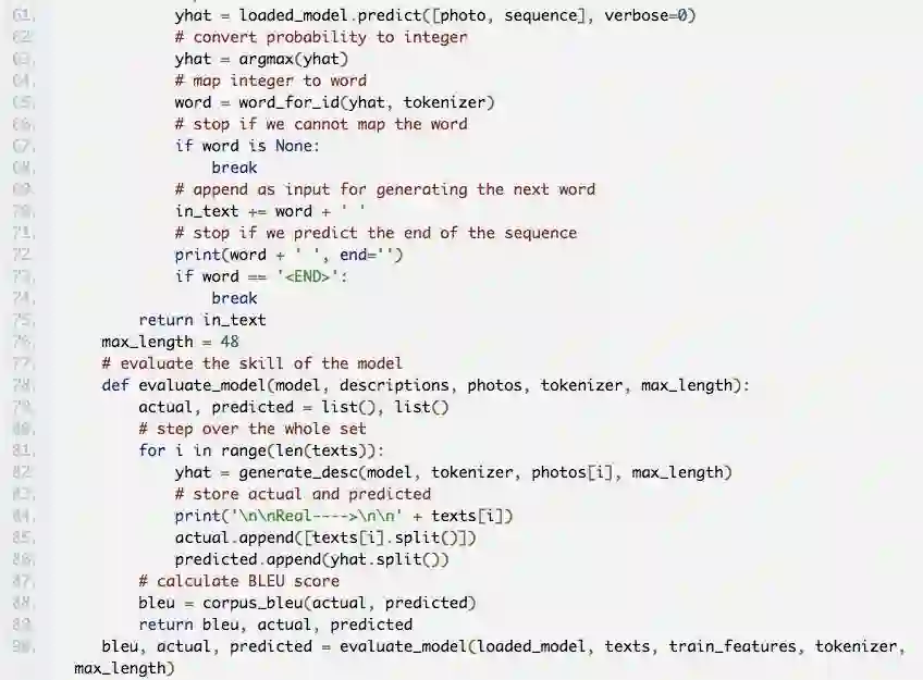 我用的是 BLEU 测评法,这是一种用于机器翻译和图像字幕模型的最佳实践。它按照 1 到 4 个单词序列把句子分成四个 gram。在下面的预测中的“cat”应该是“code”。