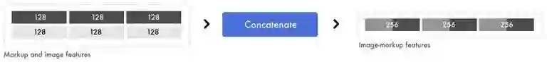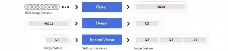 在处理词向量的同时,还会进行另一个处理。图像特征首先会被扁平化,所有的数值会被转换成一个数字列表。然后我们在这个层上应用一个密集层来抽取高级特征,随后这些图像特征会被连接到标签特征。