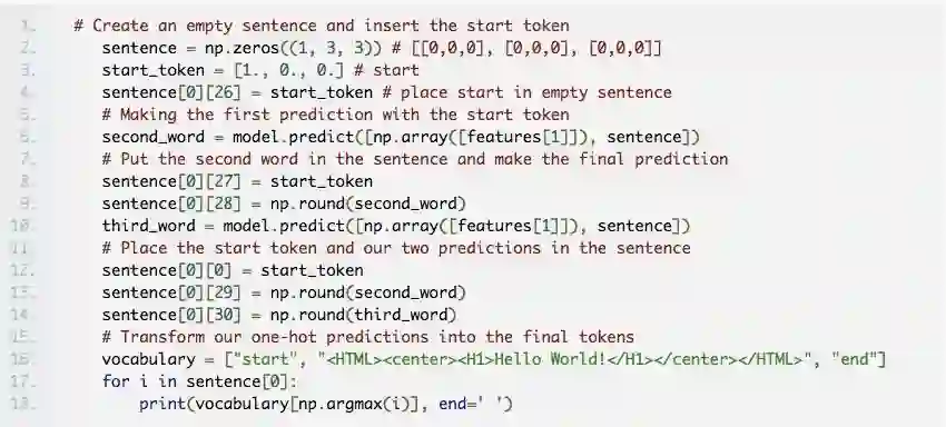 在将训练过的模型用在现实当中时,情况跟训练模型时差不多。每次使用相同的屏幕截图逐一生成文本。不同的是,现在它不会直接收到正确的 HTML 标签,而是会收到它迄今为止已经生成的标签,然后去预测下一个标签。整个预测的过程会从“起始标签”开始,在预测到“结束标签”或达到最大限度时终止。