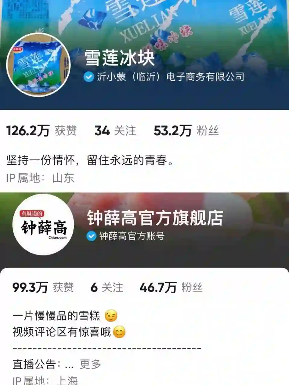 短短四天,雪莲冰块抖音官方账号粉丝数已破53万,比钟薛高的粉丝数还要高,后者运营许久在抖音上的粉丝数只有46万。