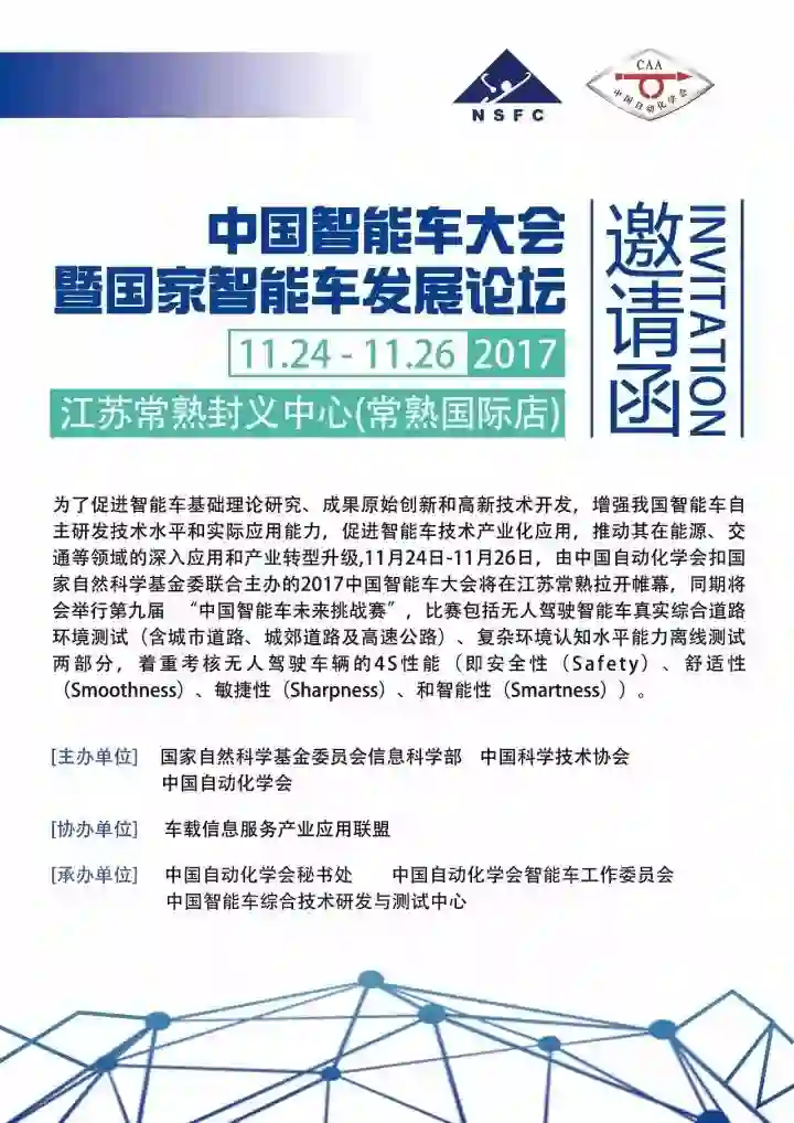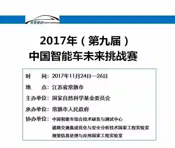 获国家自然科学基金委员会重大研究计划「视听觉信息的认知计算」资助的无人驾驶车辆验证平台项目组请务必参加本届比赛。同时,热诚欢迎从事无人驾驶智能车研发的创新创业公司、汽车制造企业、科研院所等积极参与本届比赛,共同为提升我国在视听觉信息处理领域的整体研究实力、提高无人驾驶智能车研发水平和推动国民经济与社会发展做出积极贡献。