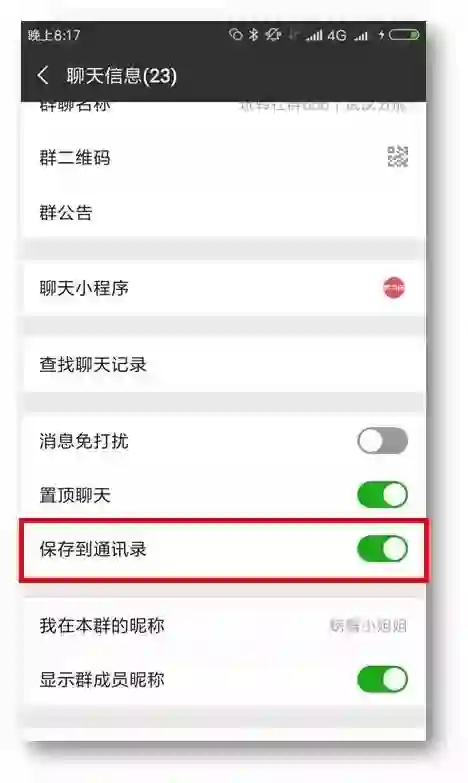 24、要避免群再次失踪,可进入群,点击右上角的人形图标,拉到下面,找到“保存到通讯录”,就可以在通讯录——群聊里面找到你要的群;没有保存的群,在重装微信或者更换手机后都会消失。